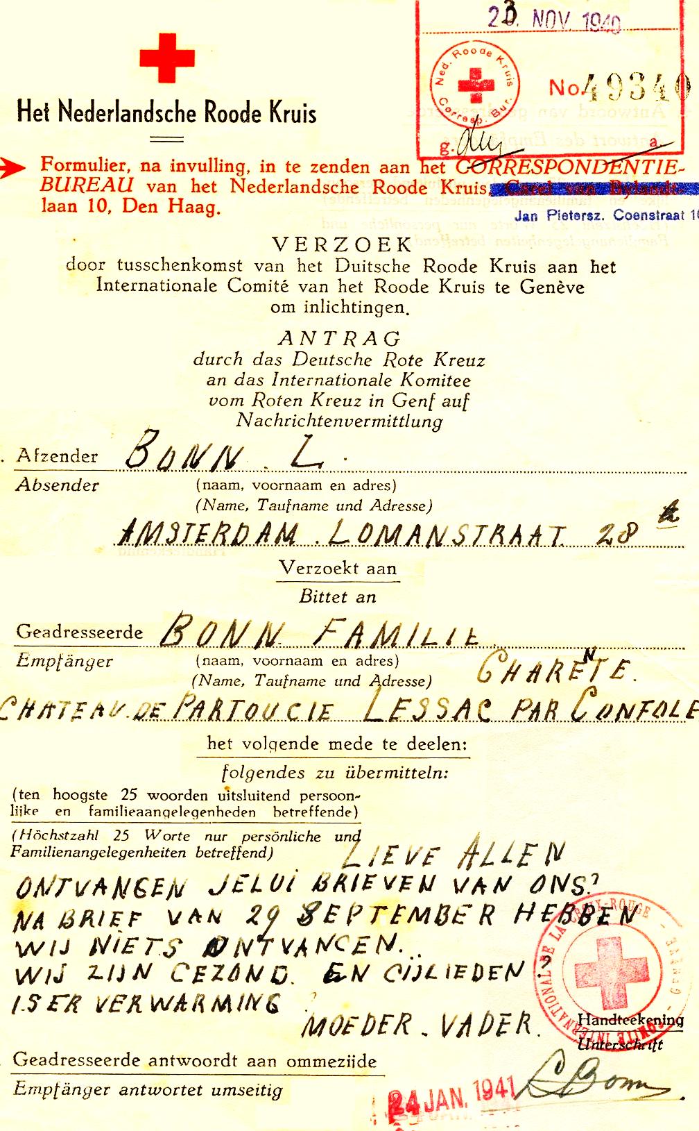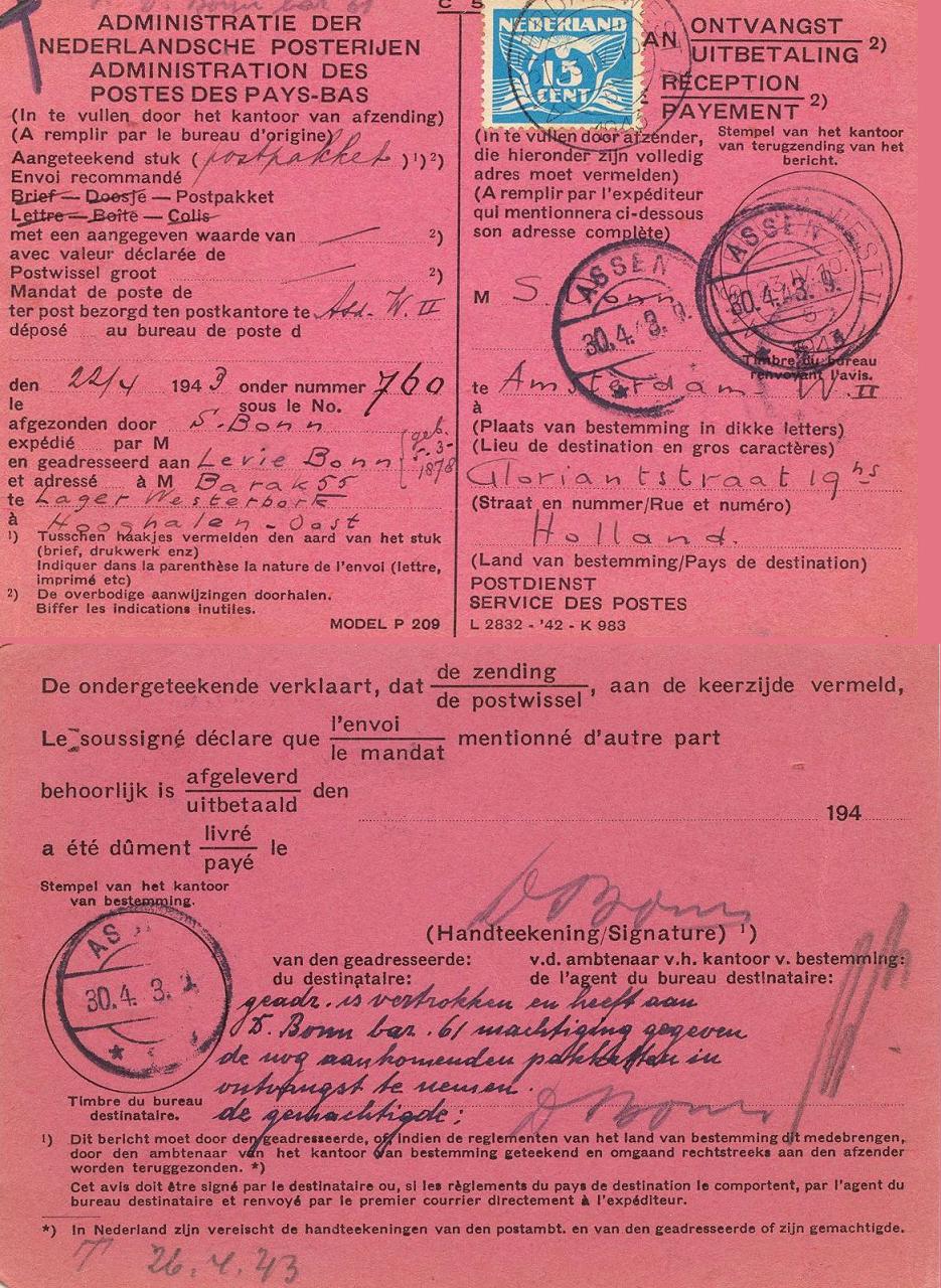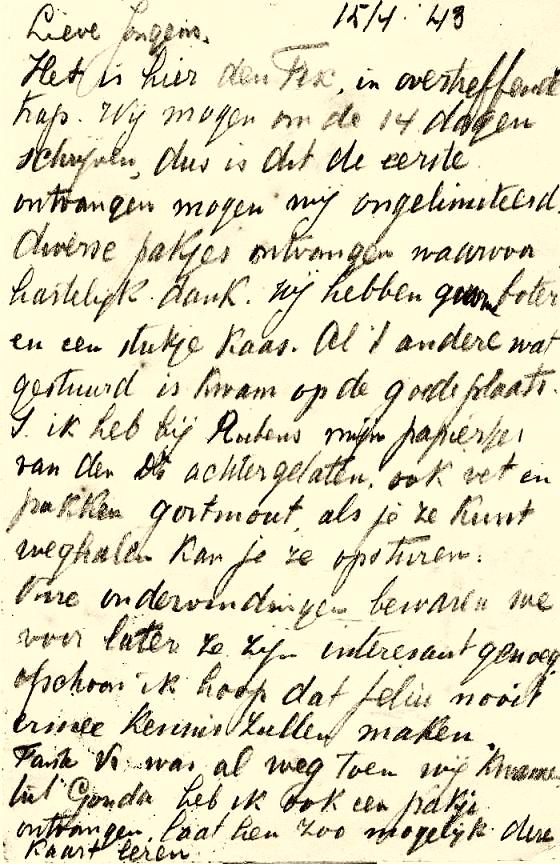 Marcus van Loen from this camp sends a card, dated 18-6-1943, written to the parents via his youngest brother to where they had been in hiding. He wrote to his brother who was supposedly a friend to prevent his family being discovered in hiding.