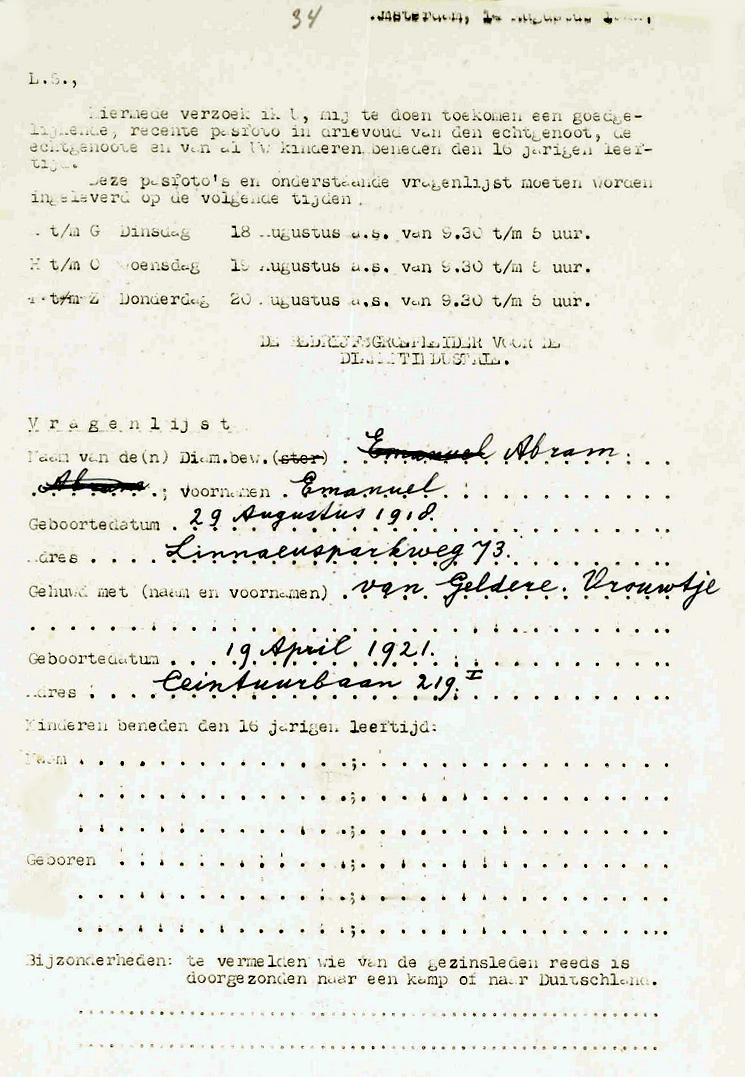 1. BAREND STOKVISCH, b. 18 January 1890, Amsterdam, Holland; d. 10 February 1943, Neukirch, Germany - Holocaust victim. 2. ZADOK STOKVISCH, b. 30 April 1891, Amsterdam, Holland; d. 28 February 1943, Auschwitz concentration camp, Poland - Holocaust victim. 3. ELIAS STOKVISCH, b. 17 February 1893, Amsterdam, Holland; d. 30 September 1942, Auschwitz concentration camp, Poland - Holocaust victim; m. JULIA FRANSMAN, 13 May 1914, Amsterdam, Holland; b. 17 January 1892, Amsterdam, Holland; d. 30 September 1942, Auschwitz concentration camp, Poland - Holocaust victim.