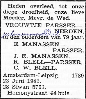 Parents of SARA GRIJSAART were Marcus Grijsaart born 25 July 1879 in Amsterdam, Holland, and died 28 September 1942 in Auschwitz concentration camp, Poland - Holocaust victim. He married JUDITH VISSER 21 March 1900 in Amsterdam, Holland. She was born 30 January 1881 in Amsterdam, Holland, and died 28 September 1942 in Auschwitz concentration camp, Poland - Holocaust victim.